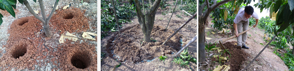 為了促進(jìn)芒果根系正常生長(zhǎng)和再生,在不同時(shí)期應(yīng)對(duì)果園做深耕和翻土處理。冬季(或采果修剪后)應(yīng)結(jié)合深翻改土,沿樹冠垂直線下挖(60cm深、30cm寬)環(huán)溝、對(duì)溝或圓形溝,切斷土壤下層的粗根,經(jīng)曬五、六天,然后施采果肥,用表土和植物殘?bào)w加以回填。結(jié)合清園,進(jìn)行中耕翻土(20cm深),以切斷表土的吸收根,減弱地下部分對(duì)地上部分水分和養(yǎng)分輸送,有利地上部分營(yíng)養(yǎng)物質(zhì)積累,促進(jìn)花芽分化。