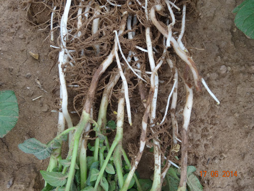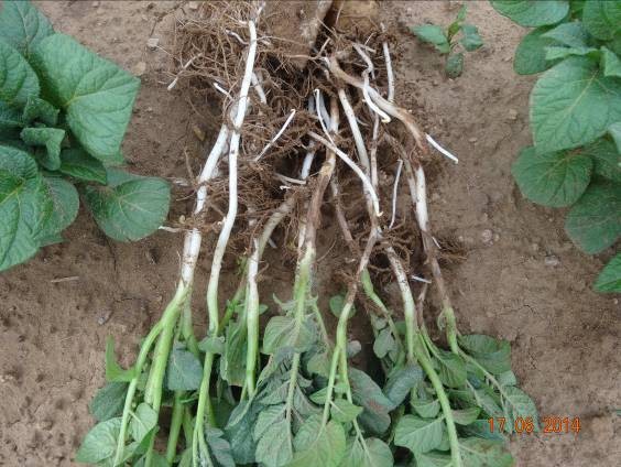 試驗背景:隨著馬鈴薯面積的擴大,連作障礙土傳性病害越來越嚴重,特別是像黑痣病、枯萎病近2年發(fā)生特別嚴重,而且治療非常困難。市面上防治這類病害的藥劑效果好的很少。2014年由于前期地溫比較低、濕度大,黑痣病感染比較嚴重,有的甚至已經(jīng)感染匍匐莖,嚴重影響到馬鈴薯的生長。