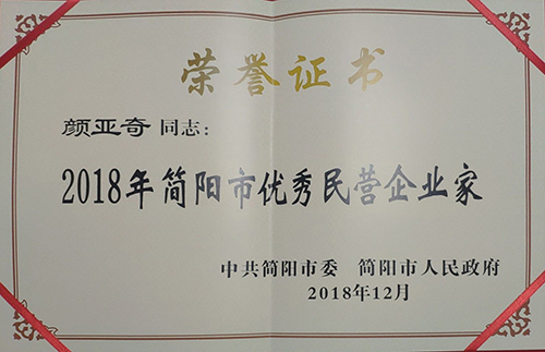 公司被授予2018年簡陽市優(yōu)秀民營企業(yè)”,公司總經(jīng)理顏亞奇被授予“優(yōu)秀民營企業(yè)家”。
