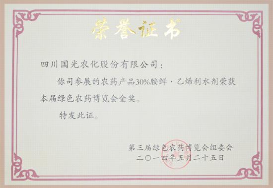 2014年5月25日,由中國農(nóng)藥發(fā)展與應用協(xié)會主辦的第三屆綠色農(nóng)藥博覽會在山東濰坊舉辦。依據(jù)《中國綠色農(nóng)藥博覽會參展農(nóng)藥評選辦法》,經(jīng)過第三屆綠色農(nóng)藥博覽會組委會認真評選,“國光30%胺鮮·乙烯利水劑”榮獲第三屆綠色農(nóng)藥博覽會金獎。這也是繼“國光0.1%三十烷醇微乳劑”獲得第一屆綠色農(nóng)藥博覽會金獎后再次榮獲金獎。
