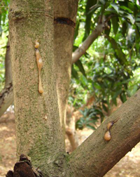 發(fā)病規(guī)律:病原為半知菌亞門擬莖點(Phomopsis mangiferae)和色二孢霉(Diplodia mangiferae)病菌均以菌絲體和子實體(分孢器)在病株和病殘體上存活。氣溫適宜時,分孢器涌出大量分生孢子,借風(fēng)雨傳播,主要從傷口侵入致病。溫暖多濕有利于病菌繁殖傳播侵染,植株、果實病、蟲傷口多樹勢哀落的果實發(fā)病較重。