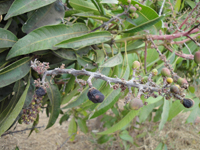 癥狀:主要危害新梢,花穗,幼果和壯果,此病可引起葉斑、梢枯、落花、落果和果腐,并有明顯潛伏現(xiàn)象。葉片感病后現(xiàn)不定形圓形或半圓形褐斑。枝梢、花穗染病變褐色枯死,梢期表現(xiàn)為葉片上病斑初期為小黑點,逐步擴大干枯穿孔,影響光合作用;花期容易在花桿部造成逐步擴大病斑、干花;危害幼果和采收前的果實、果面現(xiàn)形狀不一稍凹陷的紫褐色至黑色病斑,潮濕時現(xiàn)朱紅色粘質(zhì)小點,隨后病斑連成斑塊,至全果變黑腐爛、幼果皺縮脫落。