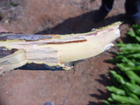 發(fā)生原因:在幼果發(fā)育至橄欖大時即開始裂果,到果實有雞蛋般大小即進入迅速膨大期至生理成熟前期時達到最高峰。裂果率因品種不同,差異也很大。象芽芒一類的品種最易裂果。果實被蟲咬傷或機械傷后,若遇驟雨,吸水過多,則會造成突發(fā)性裂果。所以裂果既屬生理性病害,也受外界環(huán)境的影響。要解決裂果問題,必須采取綜合性的措施。