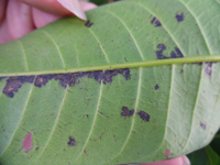 癥狀:煤煙病主要危害葉片、果實和枝梢。被害葉片見薄膜狀黑色霉層所覆蓋,外觀如被煙薰過一樣,有的霉層還有粘質(zhì)物,是刺吸式口器昆蟲分泌的“蜜露”,后期薄膜狀霉層可部分剝落。被害果實果面出現(xiàn)大小不等的黑色霉點,相互連成大的霉斑,嚴(yán)重的果面大部分或全果都被黑霉所覆蓋,影響果實外觀和商品價值。