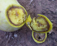 癥狀:受害果實多在靠近蒂部現(xiàn)水嘖施腐狀褐色至暗褐色病斑,有的斑面具輪,病斑迅速擴展,至全果大部分變深褐色至紫褐色,內(nèi)部果肉軟化腐爛、流汁、果核亦變褐色潮濕時斑面出現(xiàn)小黑粒,即是病征(病菌分孢器)。
