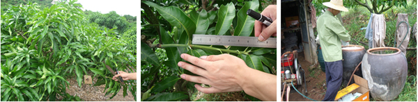 海南三亞英州鎮(zhèn)種植戶蔡桂香,在2010年5月20日,使用國光烯效唑、國光萘乙酸(5%水劑)對臺農(nóng)芒進(jìn)行葉面控梢處理。后期表現(xiàn)效果:不“沖梢”,催花容易,出花整齊。圖為蔡貴香果園。