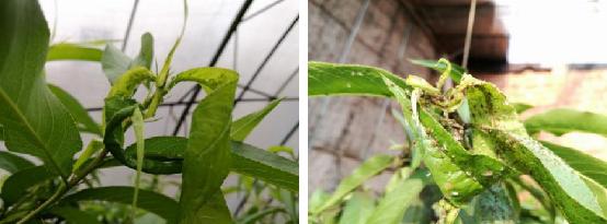 蚜蟲主要為害桃樹幼嫩枝葉,春季當(dāng)桃樹發(fā)芽展葉時,蚜蟲聚集桃樹嫩枝和新葉上,用細(xì)長的口針刺入植物組織內(nèi)部吮吸汁液,桃葉受害后呈現(xiàn)黑點(diǎn)、紅色或黃色斑點(diǎn),葉卷曲皺縮,導(dǎo)致葉片干枯或提前脫落,嚴(yán)重影響桃樹枝葉正常生長。同時蚜蟲排泄的蜜露、污染葉面及枝梢,使桃樹生理活動受阻,常造成煙煤病,同時加速桃葉早期落葉。