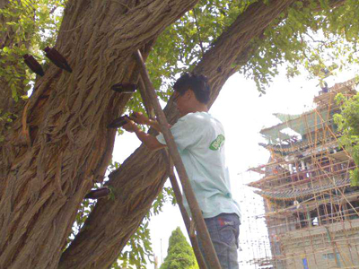 這兩棵古樹差不多有三層樓高,樹根盤枝錯(cuò)節(jié),樹體朝一側(cè)傾斜著,被工作人員用鋼管支架精心支撐住。據(jù)了解,2013年,永寧縣林業(yè)局邀請(qǐng)自治區(qū)林業(yè)廳、銀川市園林局專家對(duì)這兩棵刺槐的樹齡進(jìn)行鑒定,專家根據(jù)兩棵樹的高度、直徑,結(jié)合樹種的正常生長速度進(jìn)行估算,結(jié)論是兩棵刺槐樹齡均已過百年。