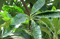 盆架子木虱,刺吸式口器害蟲(chóng),屬同翅目、木虱科昆蟲(chóng),也是一種典型的造癭昆蟲(chóng)。在廣東、海南、福建地區(qū)的盆架子上危害較重。受危害的盆架子,葉片正反面突起呈囊狀蟲(chóng)癭(見(jiàn)圖1)。 葉片卷曲,皺縮。若蟲(chóng)分泌蜜露堵塞葉片的氣孔,既嚴(yán)重影響葉片的光合作用和呼吸租用,還容易誘發(fā)煤污病,影響植株正常生長(zhǎng),降低其觀賞價(jià)值。