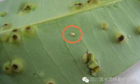 圖2.從“包狀物”內(nèi)剝離出的木虱幼蟲(chóng)(圓圈內(nèi)) 圖3.木虱成蟲(chóng)(圓圈內(nèi)),黑色小孔為羽化孔